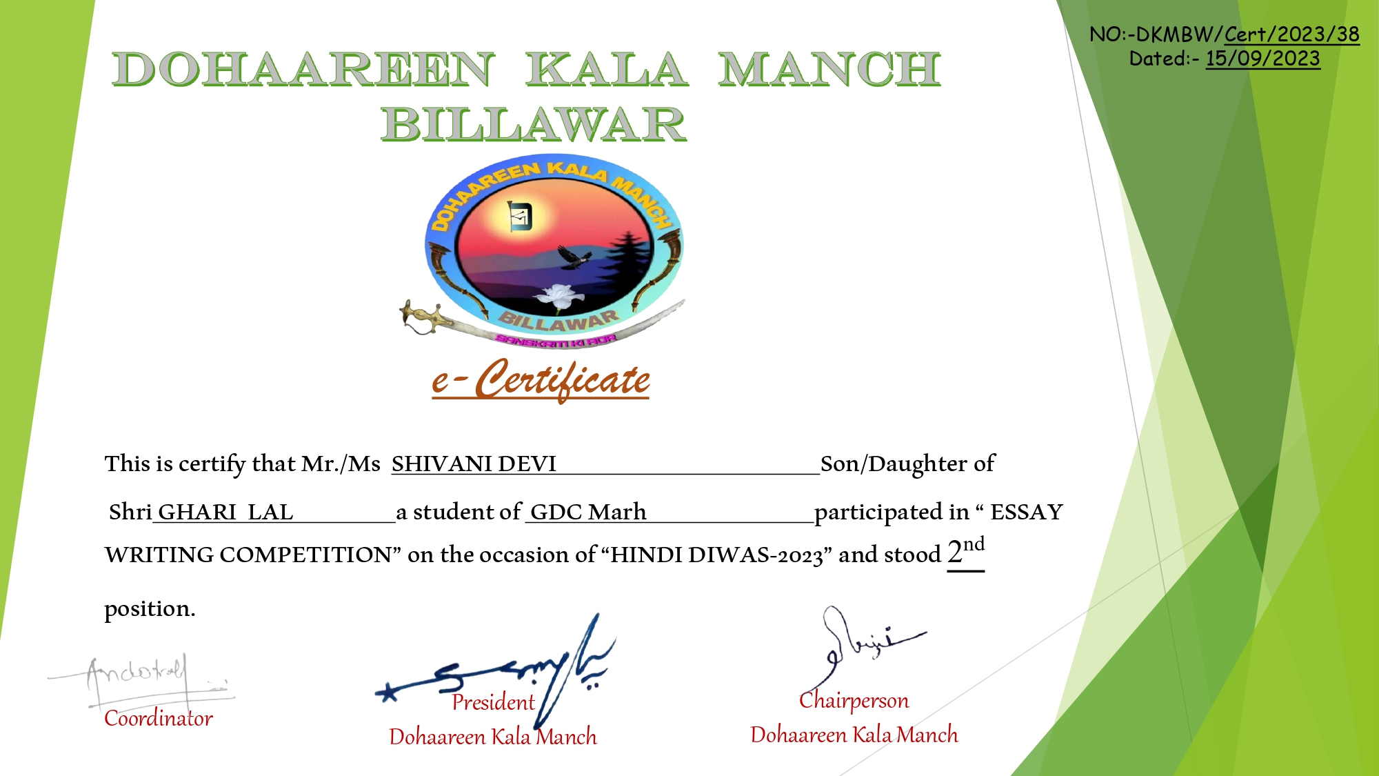 Certificates of participants of students of GDC Marh participated in “ POETRY WRITING COMPETITION” on the occasion of “HINDI DIWAS-2023”.