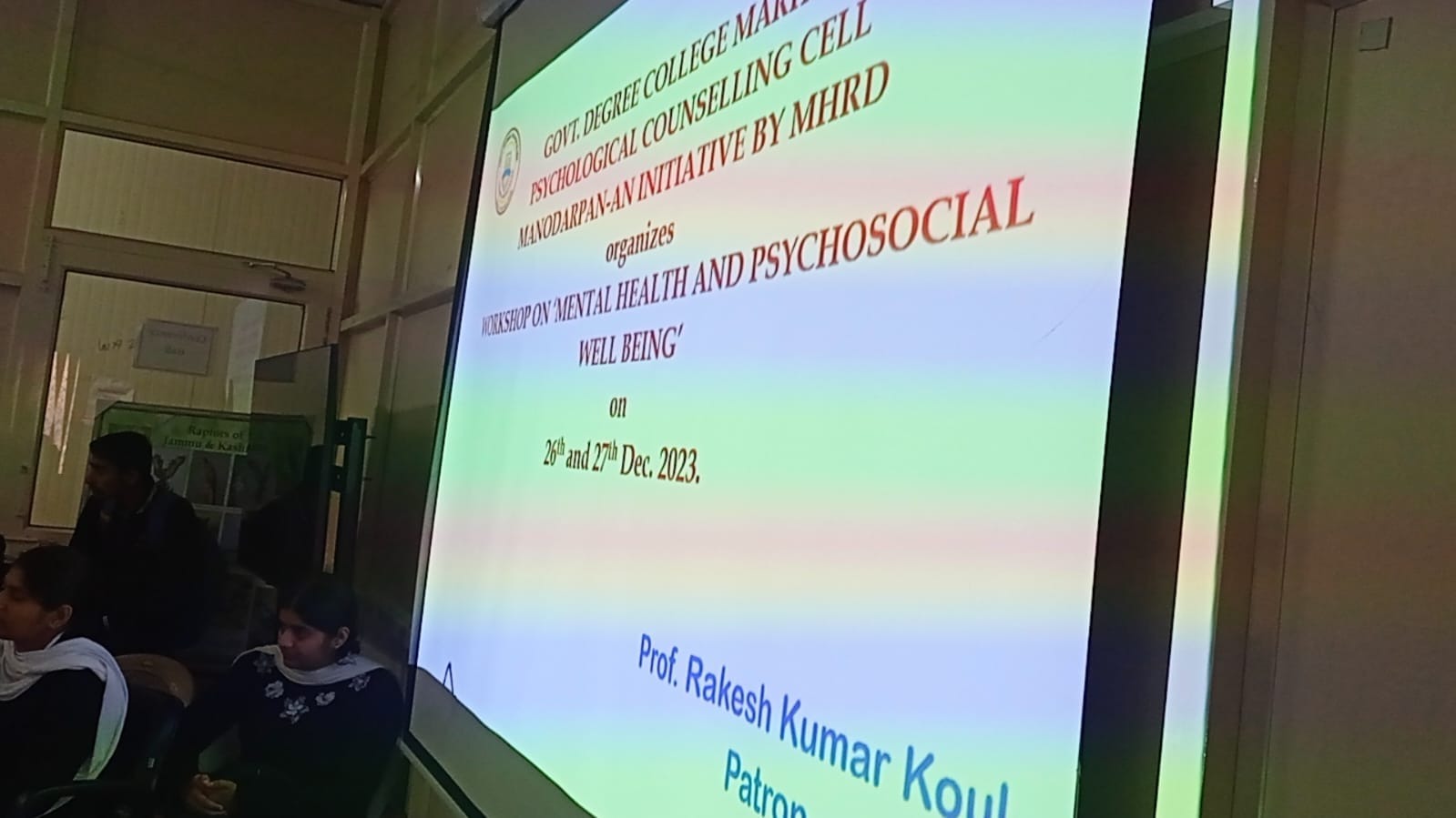 Under the initiative Manodarpan, Psychological Counselling Cell, GDC Marh organised two days workshop on Mental Health and Psychosocial well being in the college for students and faculty under the guidance Principal Prof. (Dr.) Rakesh Kumar Koul where he stressed that psychological well being and Mental Health Awareness is the need of the hour, it is the corner stone of our overall well-being, and its significance cannot be overstated and hoped that students of the college will definitely come-up with their concerns got benefitted from the workshop.