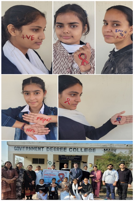 To commemorate World AIDS Day, Red Ribbon Club GDC Marh in collaboration with J&K AIDS Control Society under the aegis of Higher Education Department organised three day (30th nov -2nd dec 2023) awareness programme in the college premises under the guidance of worthy Principal Prof. Dr.Rakesh Kumar Koul. In his address he emphasised on the need of satisfaction under all circumstances and simple habits to have a successful and blissful life. He also highlighted the ill effects and stigma associated with this deadly disease.