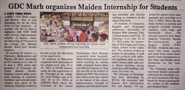 GDC Marh celebrated National Service Scheme (NSS) Day, marking the 55th anniversary of NSS foundation day. The event recognized the selfless contributions of NSS volunteers and promoted community service among students. Principal of the college Prof. Dr Rakesh Kumar Koul inaugurated the event and felicitated outstanding NSS volunteers for their exceptional service. In his address to NSS Volunteers, he quoted the prayer routinely sung at Sabarmati ashram by Gandhi ji and made all volunteers to recite “Vaishnav jan to tene kahiye jay, peerh paraaye janney ray …”and explained its meaning. He said that NSS Unit GDC Marh is committed to fostering social responsibility and community engagement among students. NSS Day celebrations reinforce our dedication to nurturing empathetic leaders. He shared his personal motivational experiences with NSS Volunteers and praised them for their selfless service. In two days program Online movie and quiz on Gandhi ji was organized. On the second day Swaachta Drive and group Discussion was also carried in Campus. The college NSS Unit has conducted various community service projects, and benefited number of people through various initiatives. NSS Program Officer Sachin Kumar Bhagat said that National Service Scheme (NSS) is public service program under the Ministry of Youth Affairs and Sports. NSS was launched on 24th September 1969 aimed at developing a student's personality through community service and character building. The motto of NSS is” NOT ME BUT YOU” which expresses the essence of democratic living and upholds the need for selfless service. NSS aims at demonstrating this motto through its day-to-day programmes. The event ended with a vote of thanks by the NSS Program Officer Sachin Kumar Bhagat. Program was attended by Anjana Chib Co Convenor NSS, Ravi Sharma PTI and Kewal Sharma Library assistant and 30 NSS volunteers.
